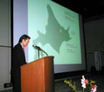| シンポジュウムで北見市の歴史的背景に根ざしたハーブと取組む市民活動「香りゃんせ公園」を発表する高木事務局長 → |